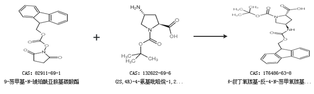 1.通過9-芴甲基-N-琥珀酰亞胺基碳酸酯和(2S,4R)-4-氨基吡咯烷-1,2-二甲酸 1-叔丁酯合成N-叔丁氧羰基-反-4-N-芴甲氧羰基-氨基-L-脯氨酸