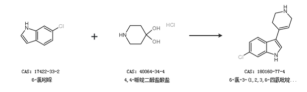 1.通過(guò)6-氯吲哚和4,4-哌啶二醇鹽酸鹽合成6-氯-3-(1,2,3,6-四氫吡啶-4-基)-1H-吲哚