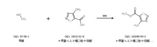 1.通過甲醇和4-甲基-1,2,3-噻二唑-5-羧酸合成4-甲基-1,2,3-噻二唑-5-羧酸甲酯,收率約99%;