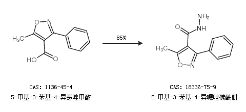 1.通過(guò)5-甲基-3-苯基-4-異惡唑甲酸合成5-甲基-3-苯基-4-異噁唑碳酰肼,收率約85%;