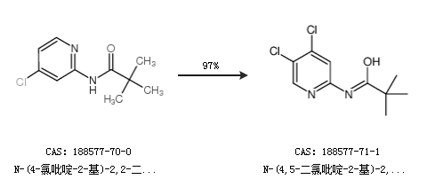 1.通過N-(4-氯吡啶-2-基)-2,2-二甲基丙酰胺合成N-(4,5-二氯吡啶-2-基)-2,2-二甲基丙酰胺,收率約97%;