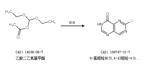 1.通過乙酸二乙氧基甲酯合成6-氯嘧啶并[5,4-d]嘧啶-4(3H)-酮,收率約81%;