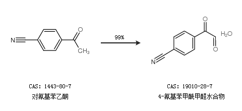 1.通過(guò)對(duì)氰基苯乙酮合成4-氰基苯甲酰甲醛水合物,收率約99%;