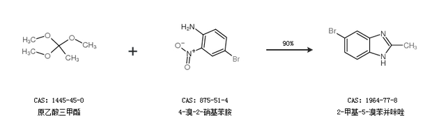 2.通過原乙酸三甲酯和4-溴-2-硝基苯胺合成2-甲基-5-溴苯并咪唑,收率約90%;