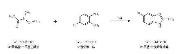 1.通過N-甲氧基-N-甲基乙酰胺和4-溴鄰苯二胺合成2-甲基-5-溴苯并咪唑,收率約84%;