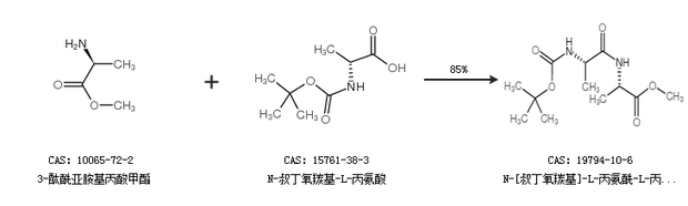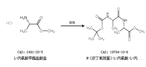 1.通過L-丙氨酸甲酯鹽酸鹽合成N-[叔丁氧羰基]-L-丙氨酰-L-丙氨酸甲酯,收率約80%;