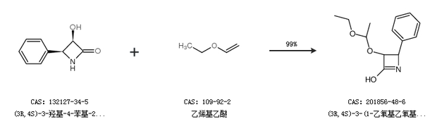 1.通過(3R,4S)-3-羥基-4-苯基-2-氮雜環(huán)丁酮和乙烯基乙醚合成(3R,4S)-3-(1-乙氧基乙氧基)-4-苯基-2-氮雜環(huán)丁酮,收率約99%;