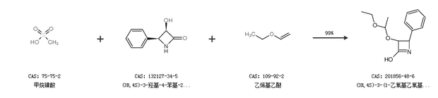 2.通過甲烷磺酸、(3R,4S)-3-羥基-4-苯基-2-氮雜環(huán)丁酮和乙烯基乙醚合成(3R,4S)-3-(1-乙氧基乙氧基)-4-苯基-2-氮雜環(huán)丁酮,收率約99%;