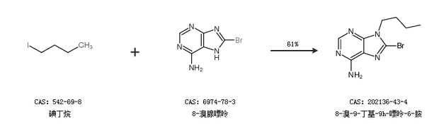 1.通過碘丁烷和8-溴腺嘌呤合成8-溴-9-丁基-9h-嘌呤-6-胺,收率約61%;