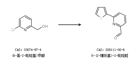 1.通過(guò)(6-氯-2-吡啶基)甲醇合成6-(2-噻吩基)-2-吡啶醛