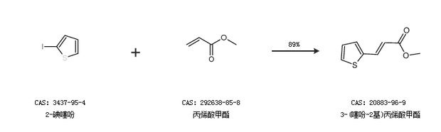 1.通過2-碘噻吩和丙烯酸甲酯合成3-(噻吩-2基)丙烯酸甲酯,收率約89%;