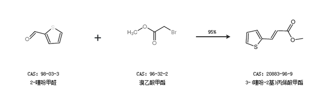 2.通過2-噻吩甲醛和溴乙酸甲酯合成3-(噻吩-2基)丙烯酸甲酯,收率約95%;