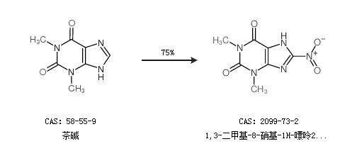 1.通過(guò)茶堿合成1,3-二甲基-8-硝基-1H-嘌呤2,6(3H,9H)-二酮,收率約75%;