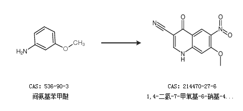 2.通過(guò)間氨基苯甲醚合成1,4-二氫-7-甲氧基-6-硝基-4-氧代-3-喹啉甲腈