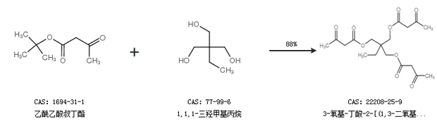 1.通過乙酰乙酸叔丁酯和1,1,1-三羥甲基丙烷合成3-氧基-丁酸-2-[(1,3-二氧基丁氧基)甲基]-2-乙基1,3-丙二基酯,收率約88%;
