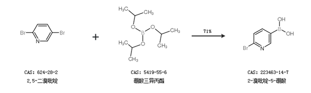 1.通過(guò)2,5-二溴吡啶和硼酸三異丙酯合成2-溴吡啶-5-硼酸,收率約71%;