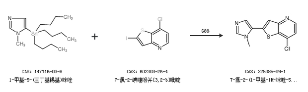 2.通過1-甲基-5-(三丁基錫基)咪唑和7-氯-2-碘噻吩并[3,2-b]吡啶合成7-氯-2-(1-甲基-1H-咪唑-5-基)噻吩并[3,2-b]吡啶,收率約68%;