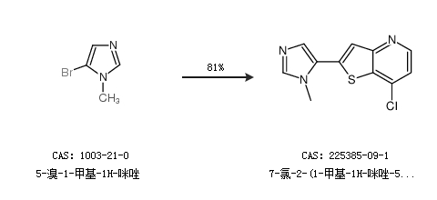 1.通過5-溴-1-甲基-1H-咪唑合成7-氯-2-(1-甲基-1H-咪唑-5-基)噻吩并[3,2-b]吡啶,收率約81%;