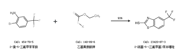 1.通過(guò)2-溴-5-三氟甲苯苯胺和乙基黃原酸鉀合成2-疏基-5-(三氟甲基)苯并噻唑,收率約93%;