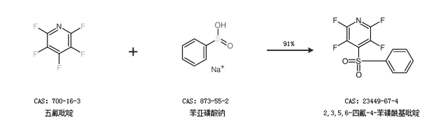 1.通過五氟吡啶和苯亞磺酸鈉合成2,3,5,6-四氟-4-苯磺酰基吡啶,收率約91%;
