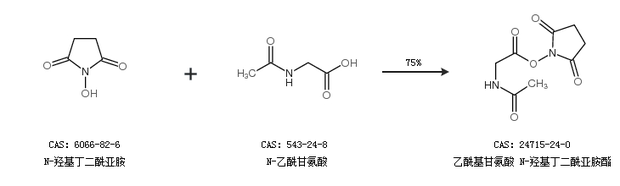 1.通過(guò)N-羥基丁二酰亞胺和N-乙酰甘氨酸合成乙?;拾彼?N-羥基丁二酰亞胺酯,收率約75%;