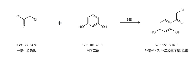 2.通過一氯代乙酰氯和間苯二酚合成2-氯-1-(2,4-二羥基苯基)乙酮,收率約62%;