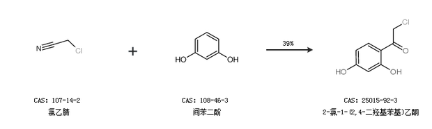 1.通過氯乙腈和間苯二酚合成2-氯-1-(2,4-二羥基苯基)乙酮,收率約39%;