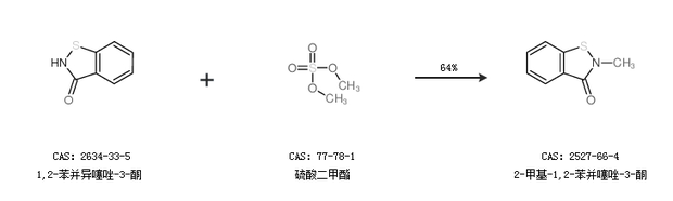 1.通過1,2-苯并異噻唑-3-酮和硫酸二甲酯合成2-甲基-1,2-苯并噻唑-3-酮,收率約64%;