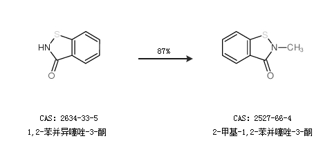 2.通過1,2-苯并異噻唑-3-酮合成2-甲基-1,2-苯并噻唑-3-酮,收率約87%;