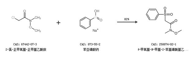 1.通過2-氯-正甲氧基-正甲基乙酰胺和苯亞磺酸鈉合成N-甲氧基-N-甲基-2-苯基磺?;阴0?,收率約82%;