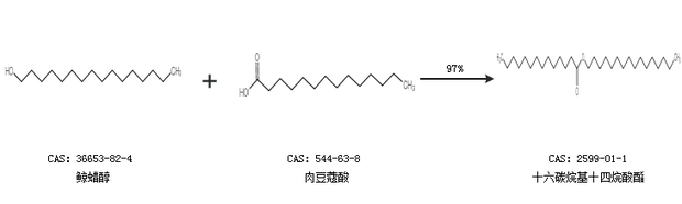 1.通過鯨蠟醇和肉豆蔻酸合成十六碳烷基十四烷酸酯,收率約97%;