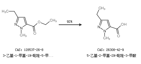 1.通過3-乙基-1-甲基-1H-吡唑-5-甲酸乙酯合成5-乙基-2-甲基-2H-吡唑-3-甲酸,收率約92%;