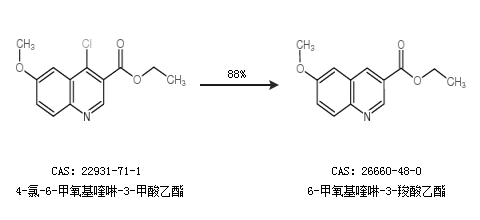 1.通過(guò)4-氯-6-甲氧基喹啉-3-甲酸乙酯合成6-甲氧基喹啉-3-羧酸乙酯,收率約88%;