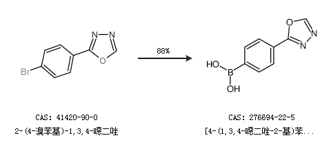 2.通過2-(4-溴苯基)-1,3,4-噁二唑合成[4-(1,3,4-噁二唑-2-基)苯基]硼酸,收率約88%;
