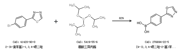1.通過2-(4-溴苯基)-1,3,4-噁二唑和硼酸三異丙酯合成[4-(1,3,4-噁二唑-2-基)苯基]硼酸,收率約82%;
