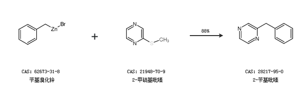 1.通過(guò)芐基溴化鋅和2-甲硫基吡嗪合成2-芐基吡嗪,收率約88%;