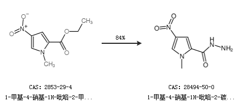 2.通過1-甲基-4-硝基-1H-吡咯-2-甲酸乙酯合成1-甲基-4-硝基-1H-吡咯-2-碳酰肼,收率約84%;