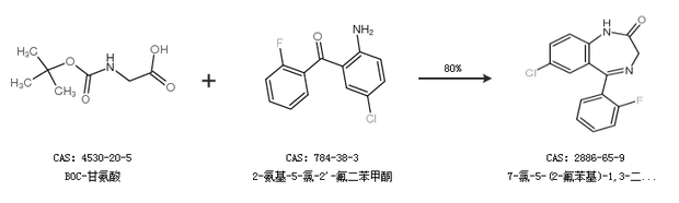 2.通過BOC-甘氨酸和2-氨基-5-氯-2''-氟二苯甲酮合成7-氯-5-(2-氟苯基)-1,3-二氫-3H-1,4-苯并二氮雜卓-2-酮,收率約80%;