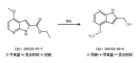 1.通過(guò)5-芐氧基-4-氮雜吲哚-2-羧酸合成2-甲醇-4-甲氧基-7-氮雜吲哚,收率約95%;