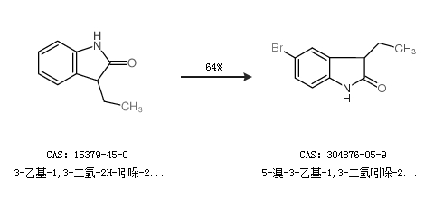 1.通過3-乙基-1,3-二氫-2H-吲哚-2-酮合成5-溴-3-乙基-1,3-二氫吲哚-2-酮,收率約64%;