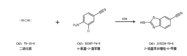 1.通過二硫化碳和4-氨基-3-溴苯腈合成2-巰基苯并噻唑-6-甲腈,收率約63%;