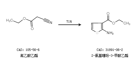2.通過氰乙酸乙酯合成2-氨基噻吩-3-甲酸乙酯,收率約71%;