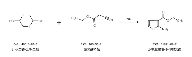 1.通過1,4-二硫-2,5-二醇和氰乙酸乙酯合成2-氨基噻吩-3-甲酸乙酯,收率約89%;