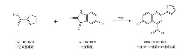 1.通過2-乙酰基噻吩和5-溴靛紅合成6-溴-2-(2-噻吩)-4-喹啉羧酸,收率約76%;