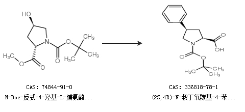1.通過(guò)N-Boc-反式-4-羥基-L-脯氨酸甲酯合成(2S,4R)-N-叔丁氧羰基-4-苯基吡咯烷-2-甲酸