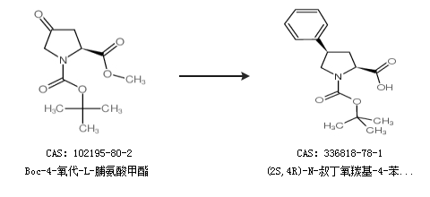 2.通過(guò)Boc-4-氧代-L-脯氨酸甲酯合成(2S,4R)-N-叔丁氧羰基-4-苯基吡咯烷-2-甲酸