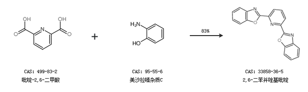 1.通過吡啶-2,6-二甲酸和美沙拉嗪雜質(zhì)C合成2,6-二苯并唑基吡啶,收率約83%;