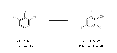 1.通過2,6-二氯苯酚合成2,6-二氯-4-碘苯酚,收率約97%;