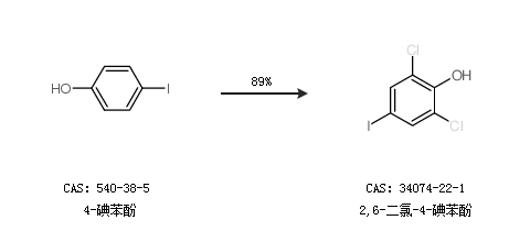2.通過4-碘苯酚合成2,6-二氯-4-碘苯酚,收率約89%;
