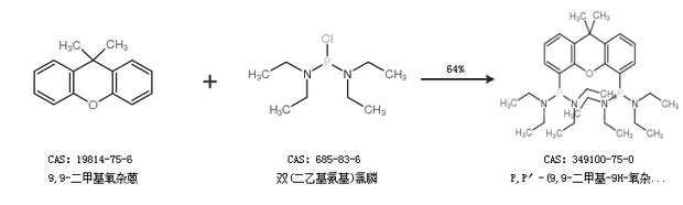 1.通過9,9-二甲基氧雜蒽和雙(二乙基氨基)氯膦合成P,P′-(9,9-二甲基-9H-氧雜蒽-4,5-二基)雙[N,N,N′,N′-四乙基-亞膦酸二酰胺],收率約64%;